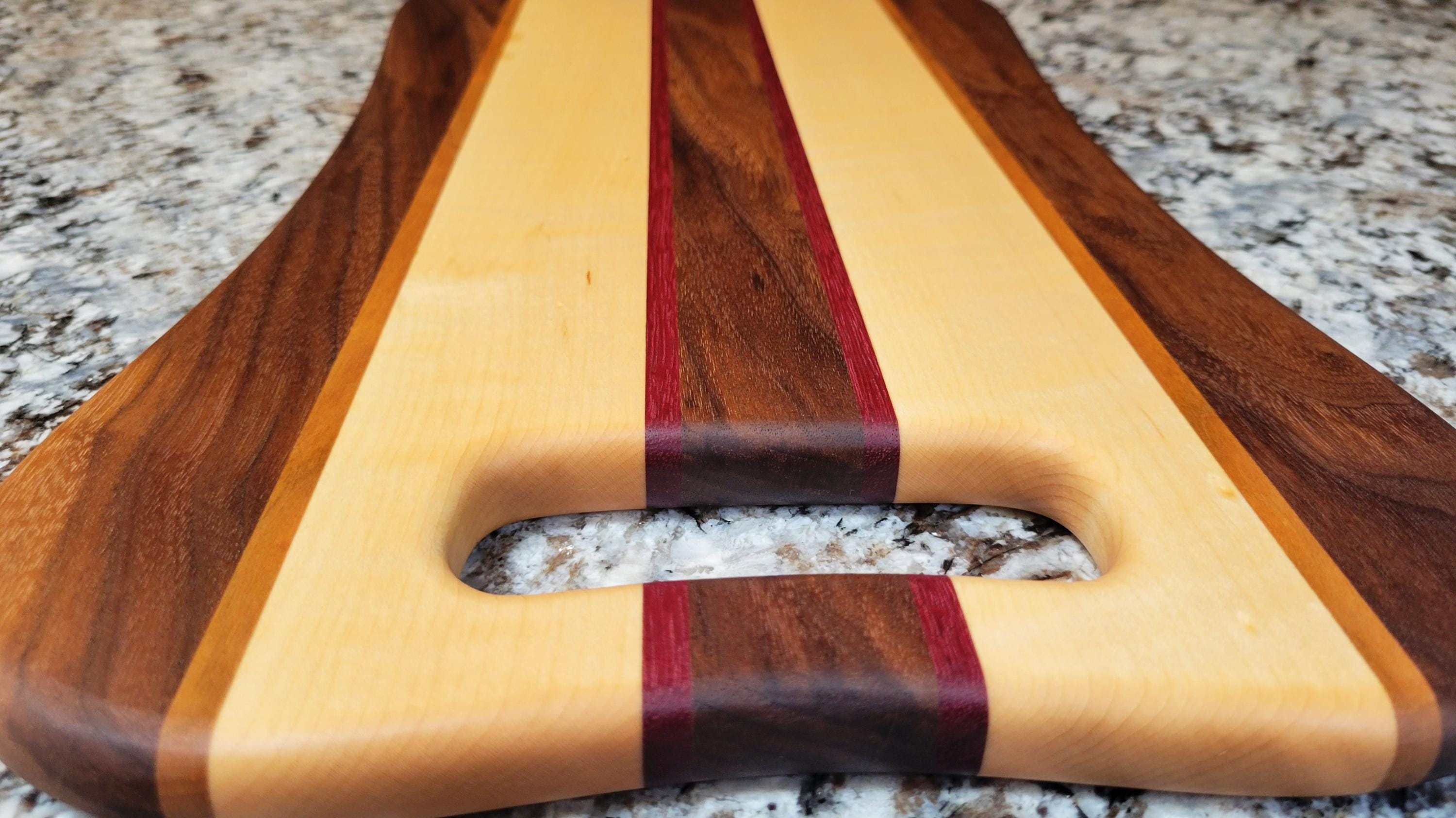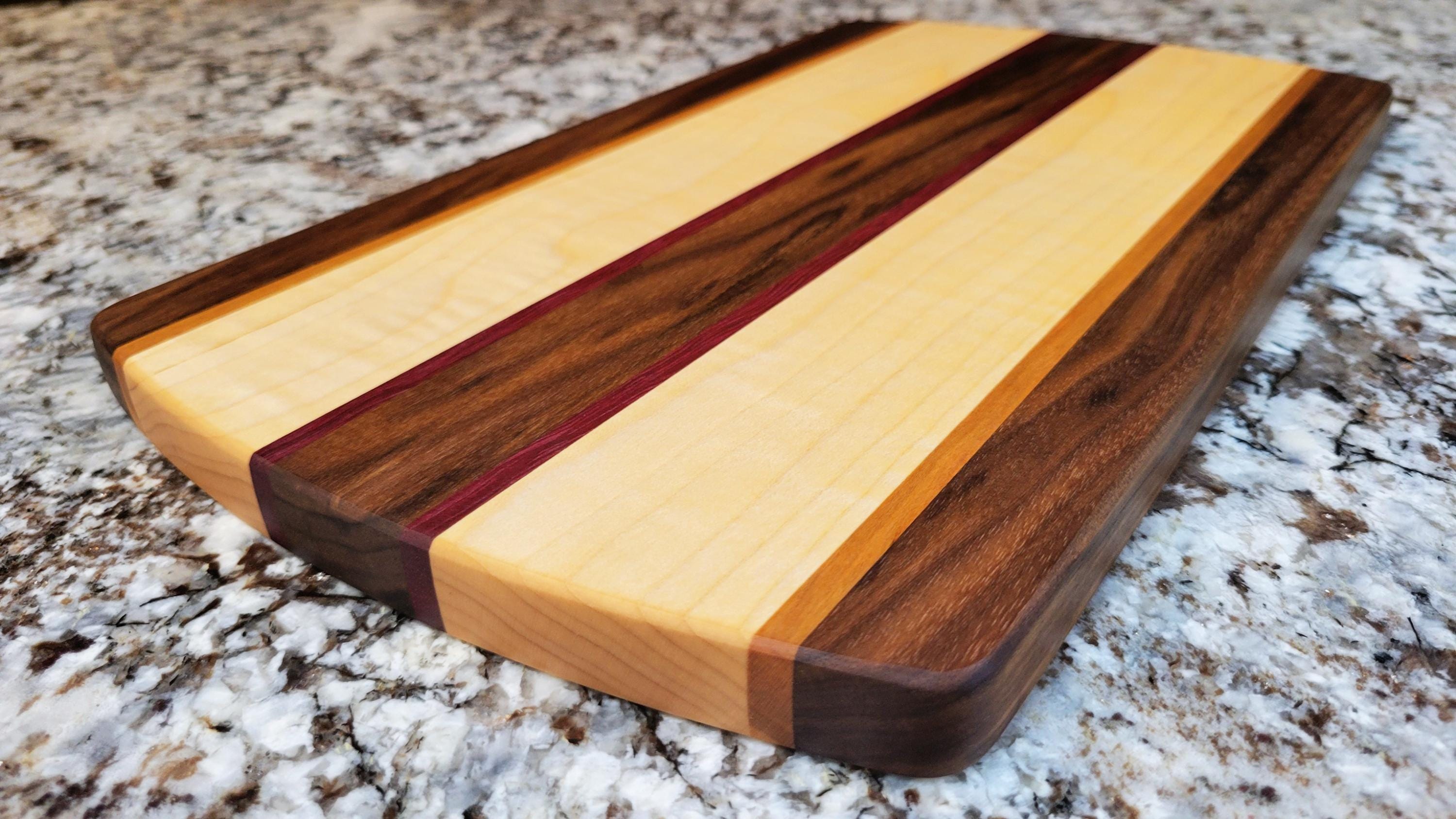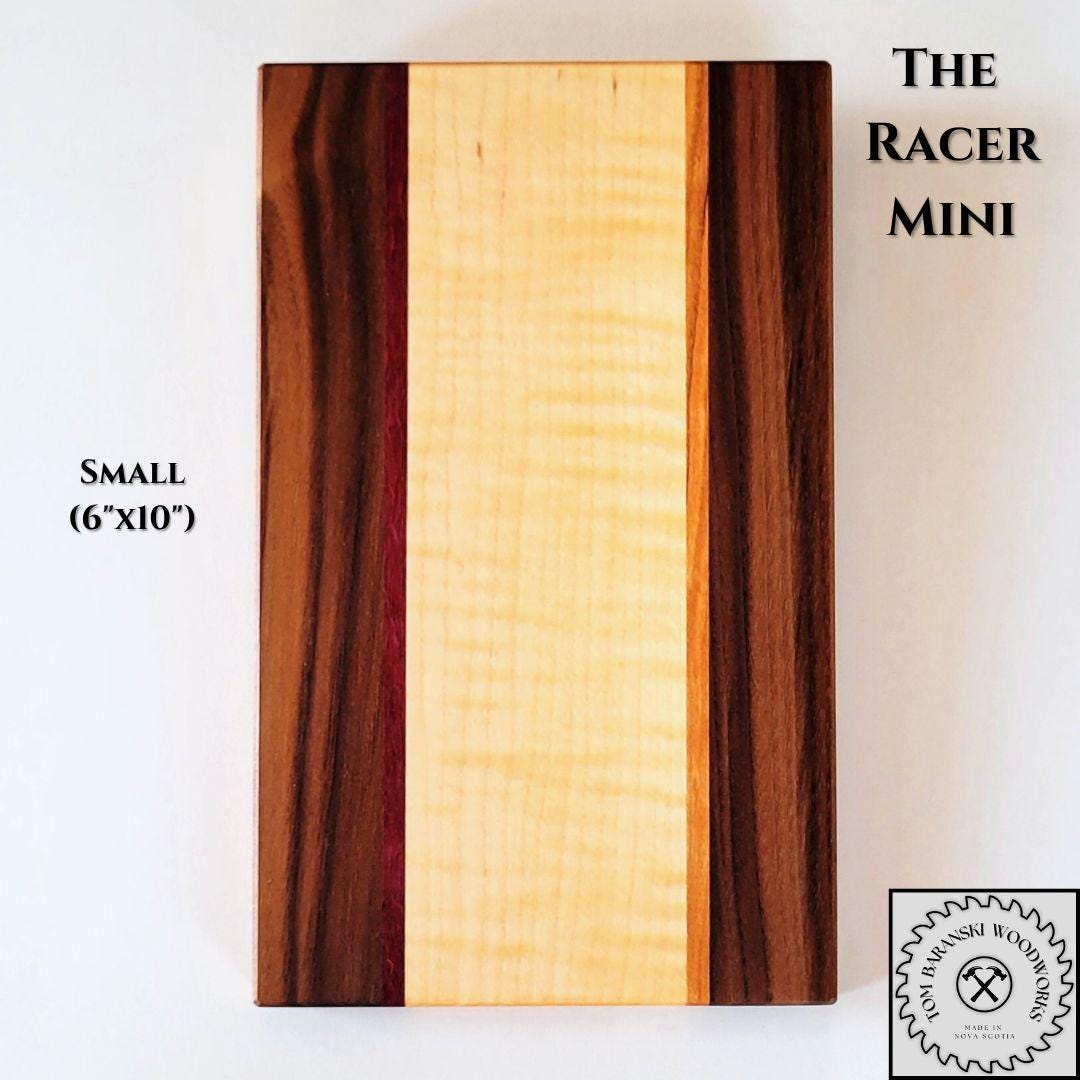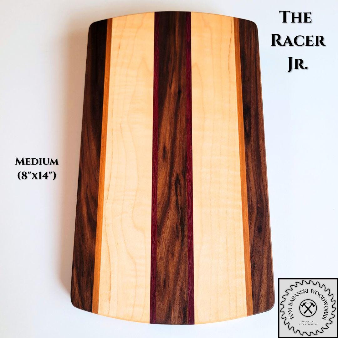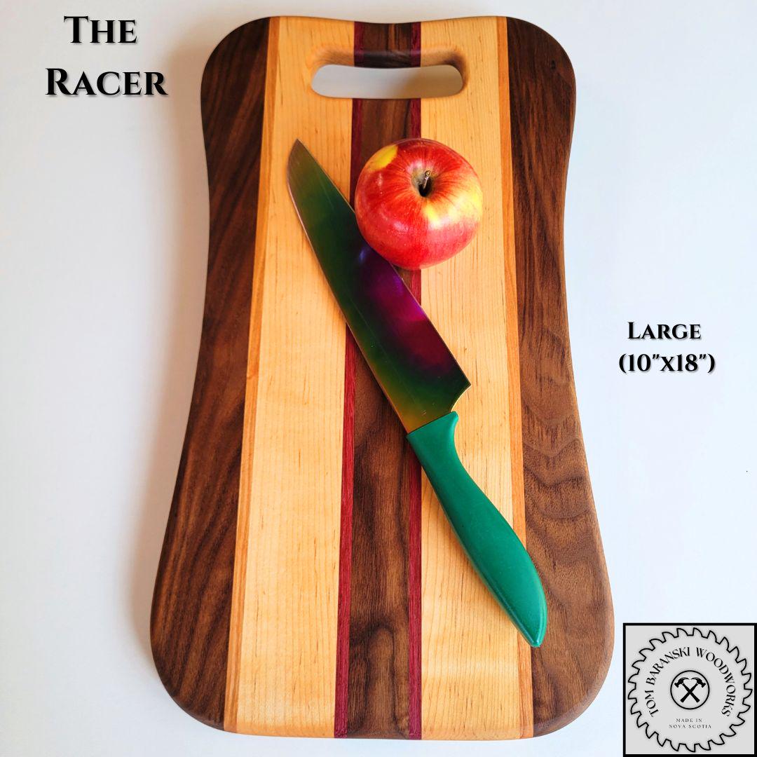 Our Racer line of cutting boards highlights the contrast between Canadian curly maple and black walnut, complemented by slivers of cherrywood and exotic purple heart. Available in three sizes, our LARGE boards are 10" x 18" and feature a curvy design with a handle for serving; our MEDIUM boards are 8" x 14" and have a simplified, yet refined shape; and our SMALL boards are 6" x 10" making them a beautiful, sleek addition to your kitchen or bar.
