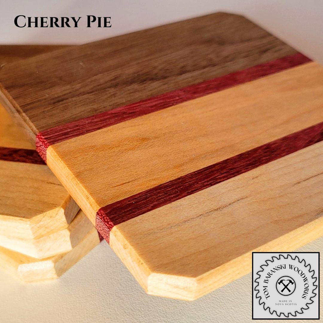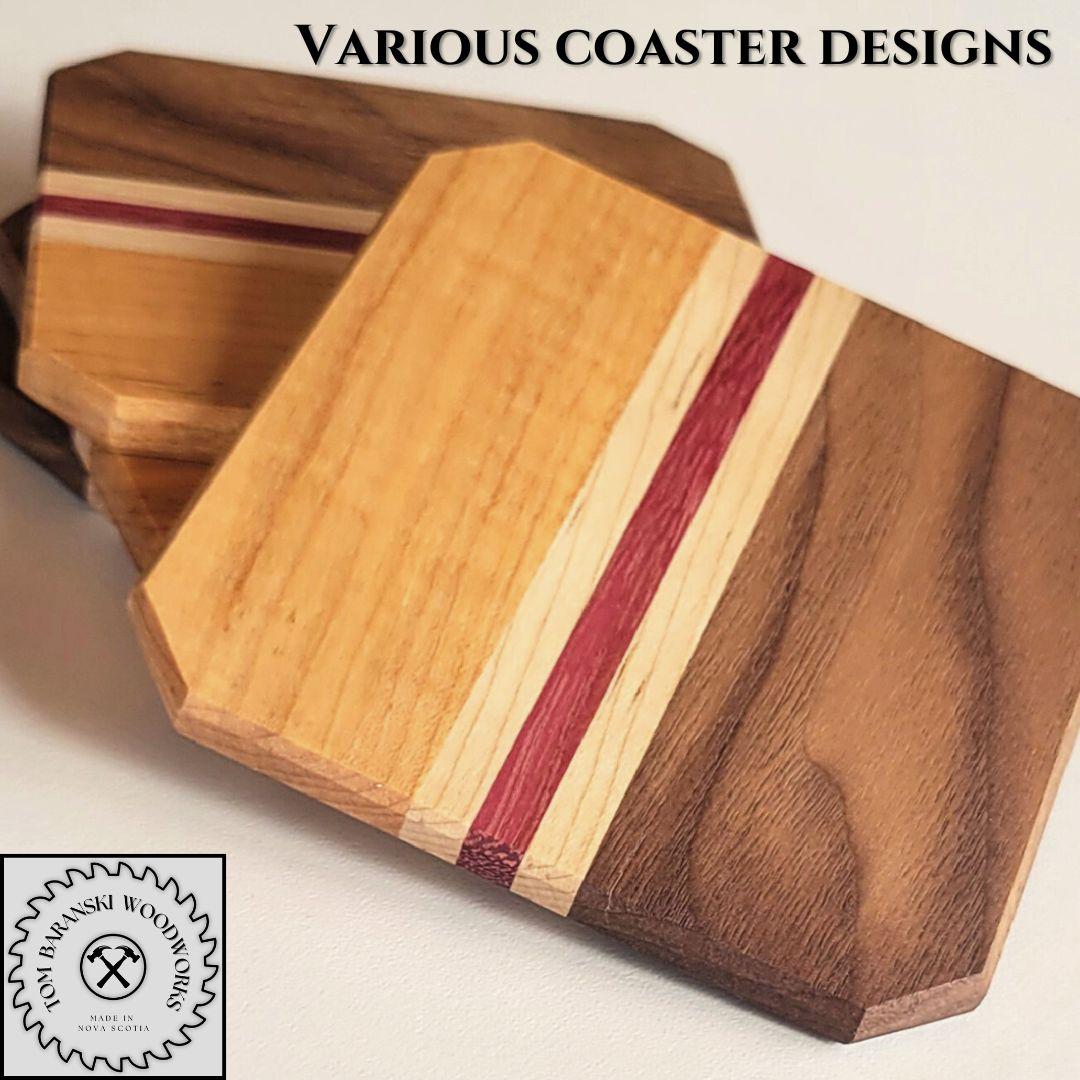 Each of our coaster sets includes four matching pieces that measure 3.75" x 3.75". They are slightly chamfered on both faces and coated in a satin polyurethane for a silky, waterproof, and durable finish. Impress your guests or give them to that special someone, these shimmering jewels are still tough enough to protect your larger furniture pieces. Like all our pieces, the grain pattern of each set of coasters is one-of-a-kind. This means everything Tom Baranski Woodworks makes is uniquely yours to enjoy.
