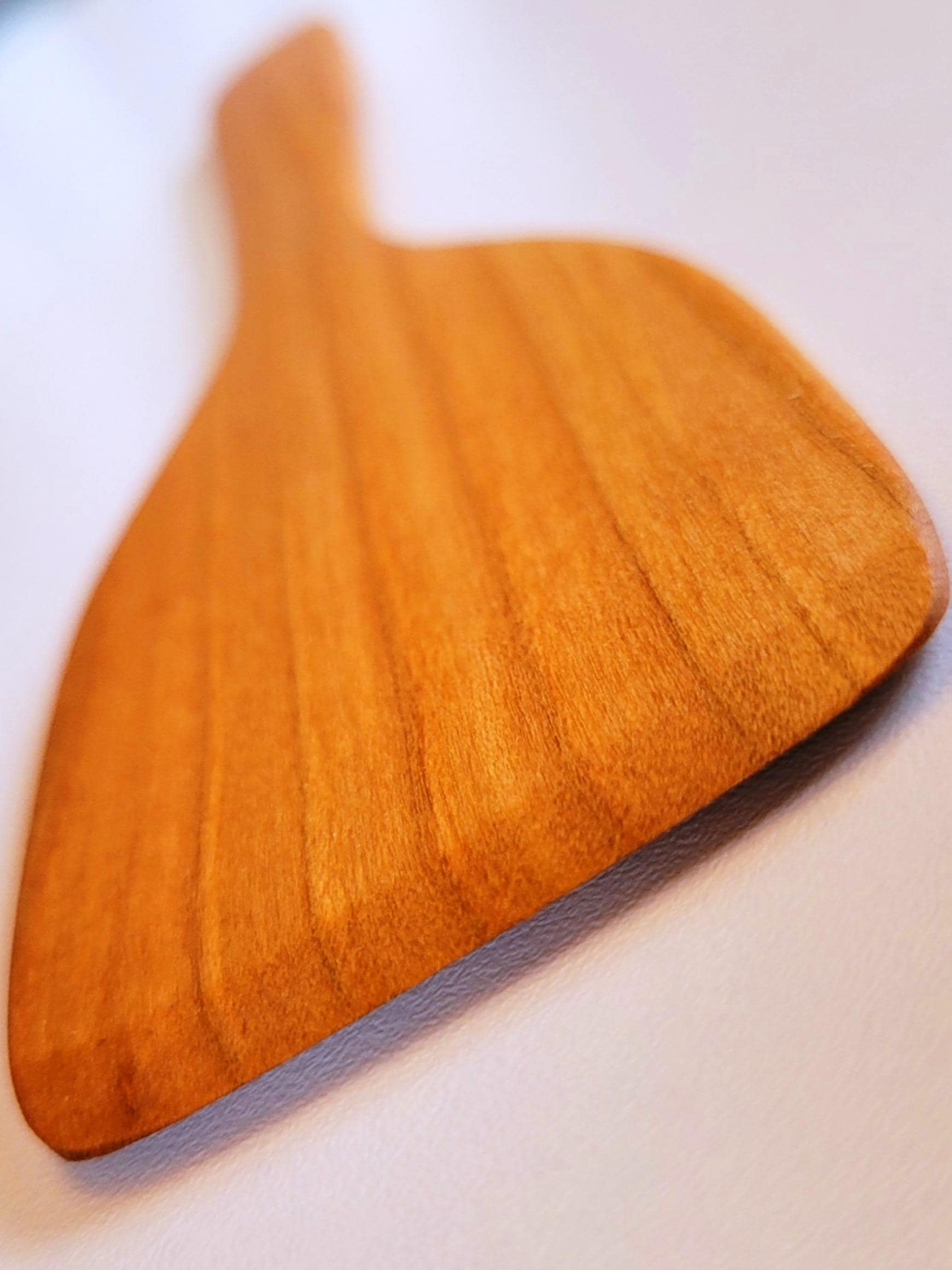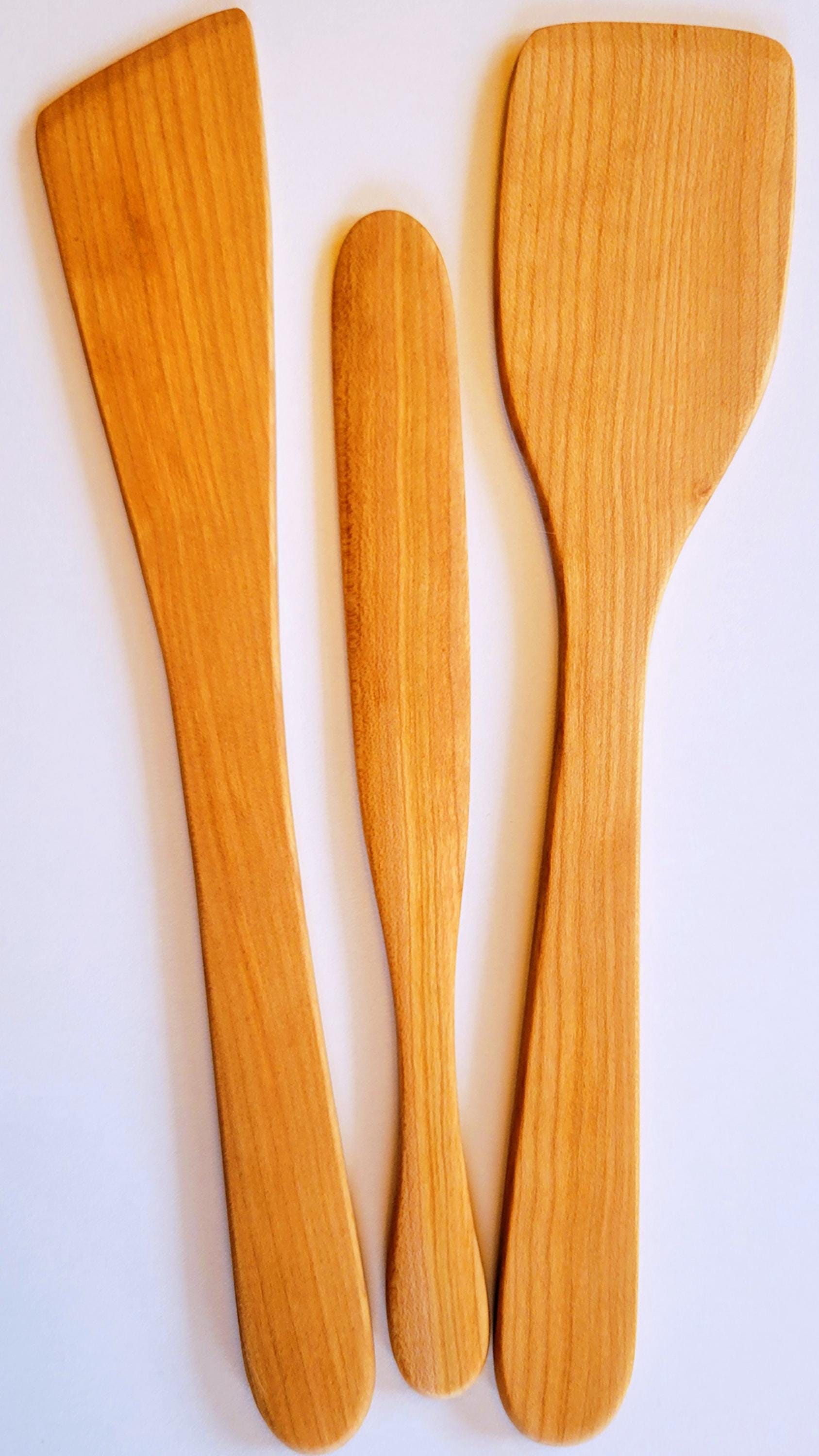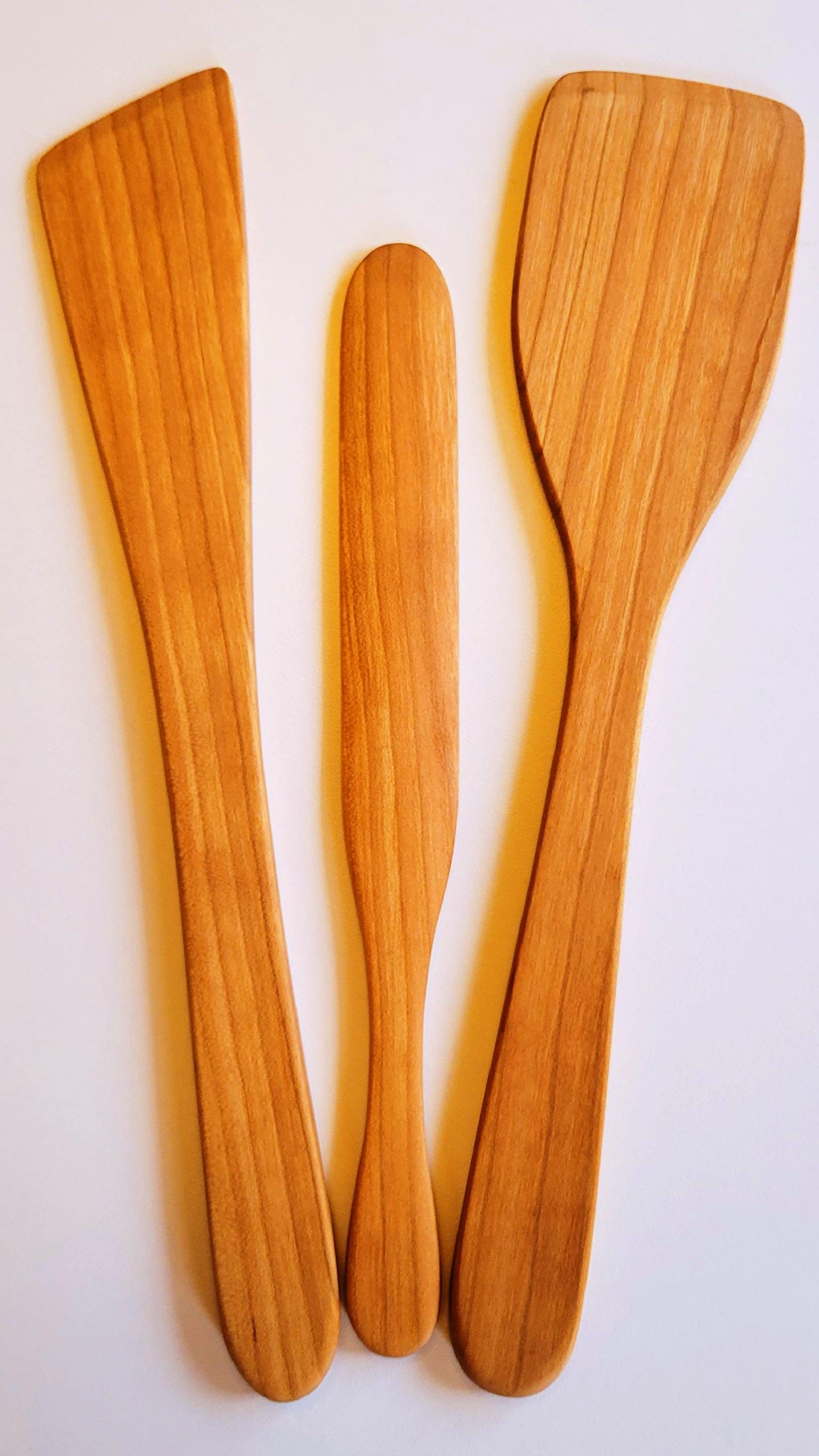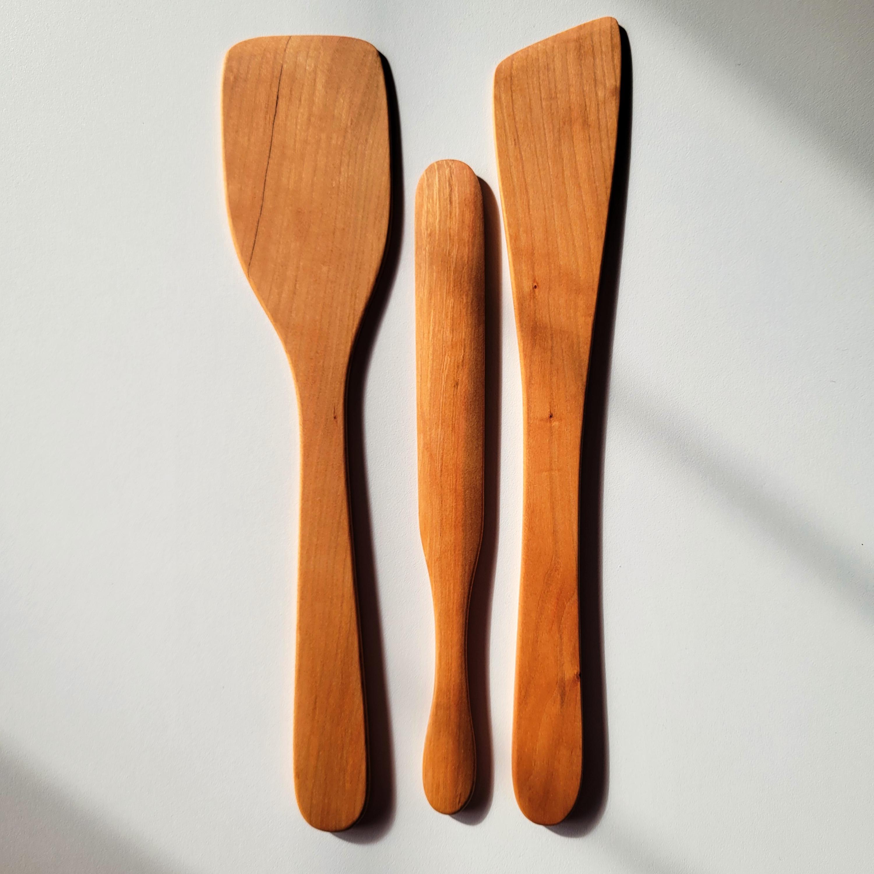 Each set includes an 11" long broad spatula, an 11" long narrow spatula, and a 9" long spreader whose design is borrowed from crepe spatulas, but shortened for a more delicate touch. Finished in two coats of mineral oil and one final coat of Howard's Butcher Block Conditioner, they are silky smooth to the touch, but don't let their delicate nature fool you. With a bit of occasional maintenance, these spatulas are built to last and to be a go-to implement in your kitchen for years. Like all our pieces, the grain pattern of each spatula, and each set of spatulas, is one-of-a-kind. This means everything Tom Baranski Woodworks makes is uniquely yours to enjoy.